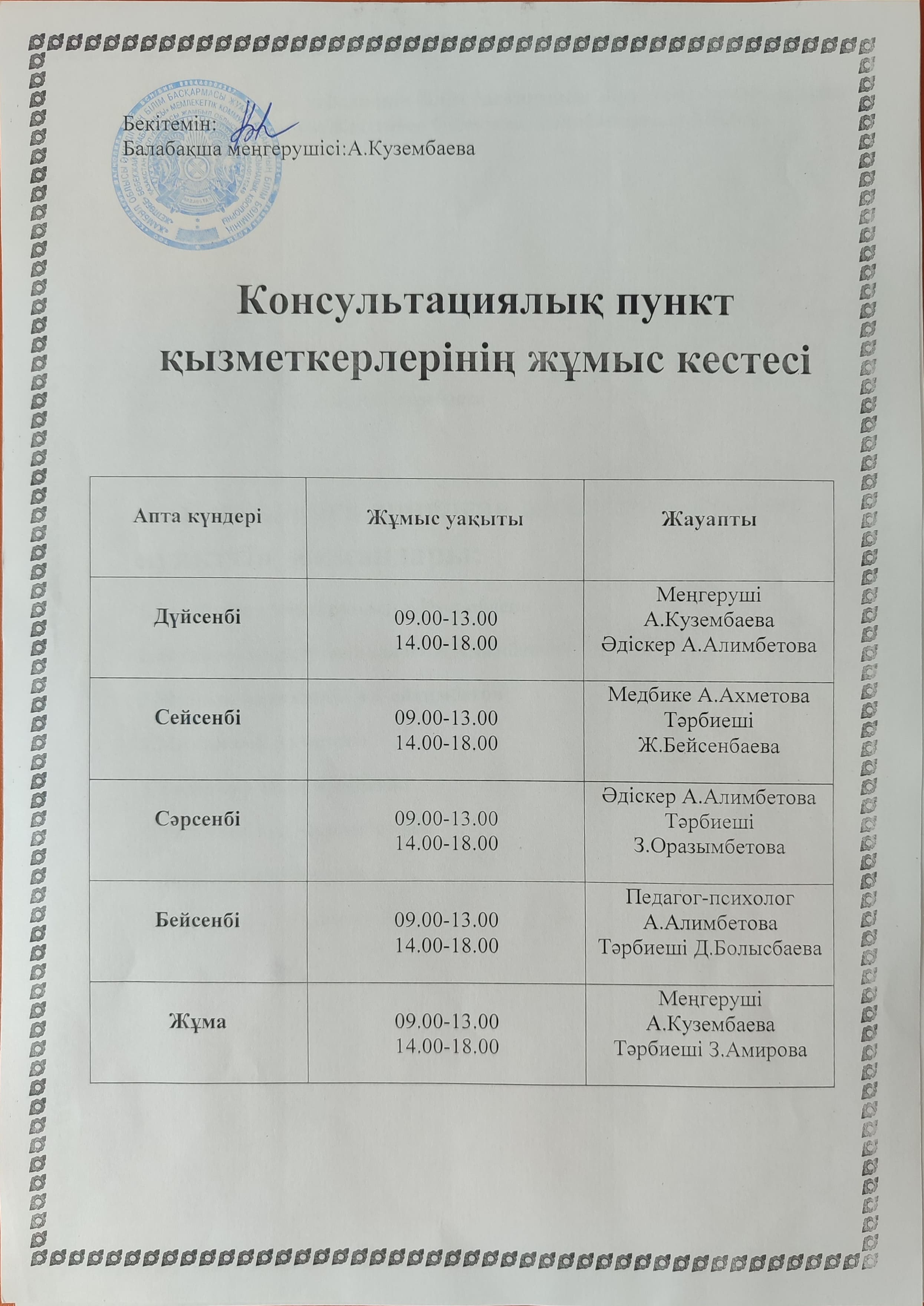 Консультациялық пункт қызметкерлерінің жұмыс кестесі